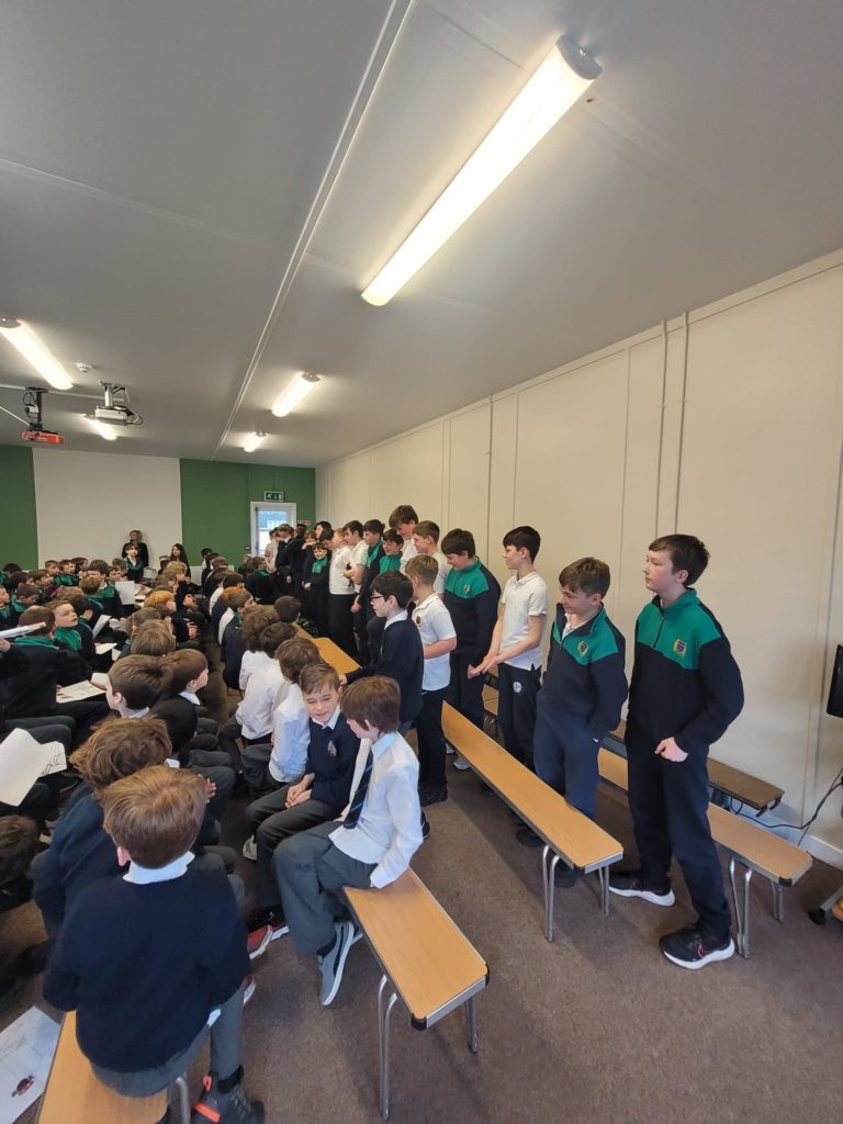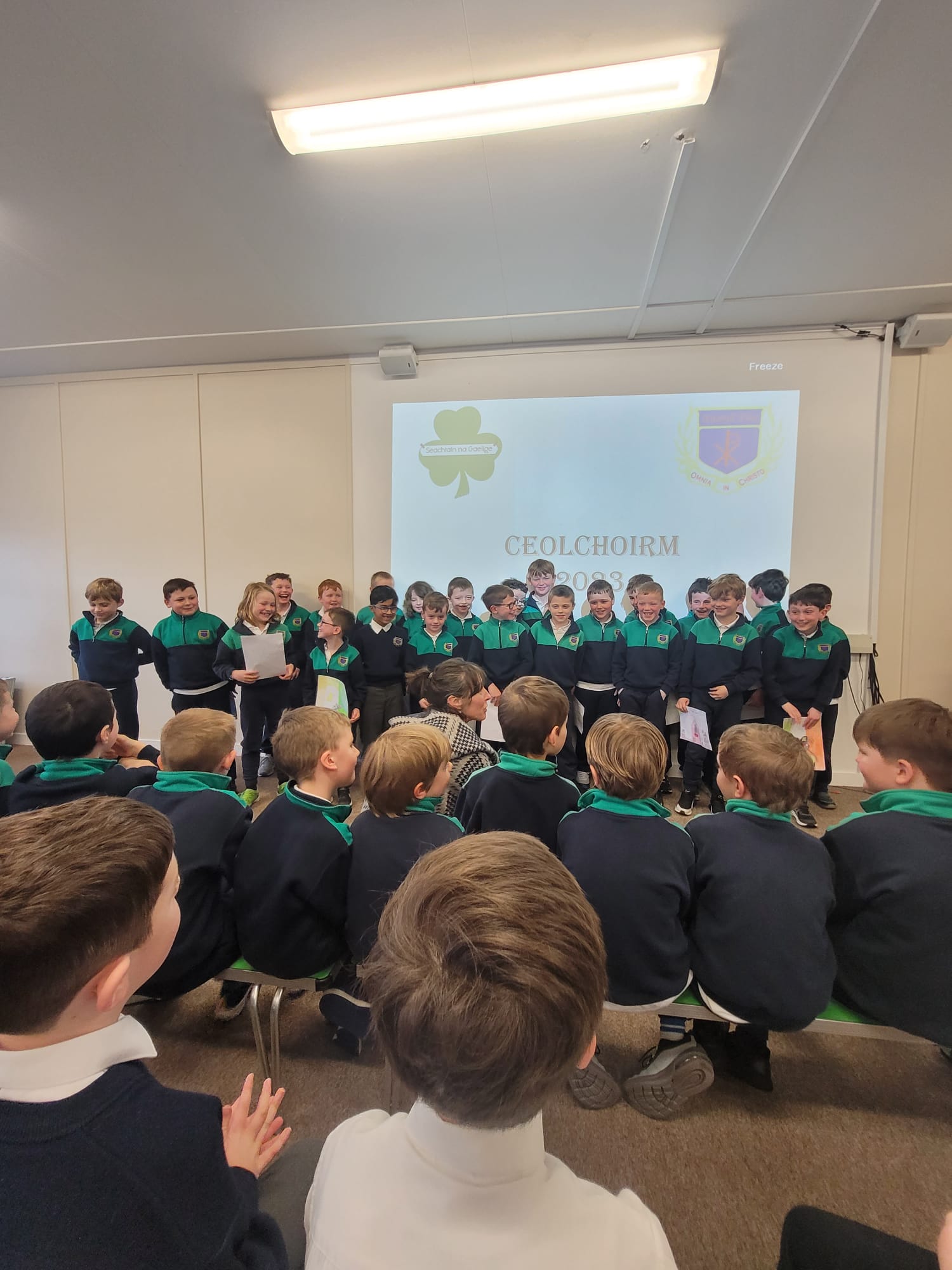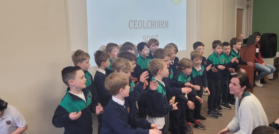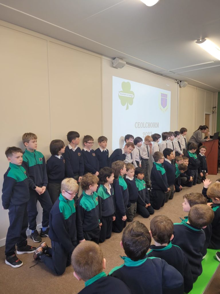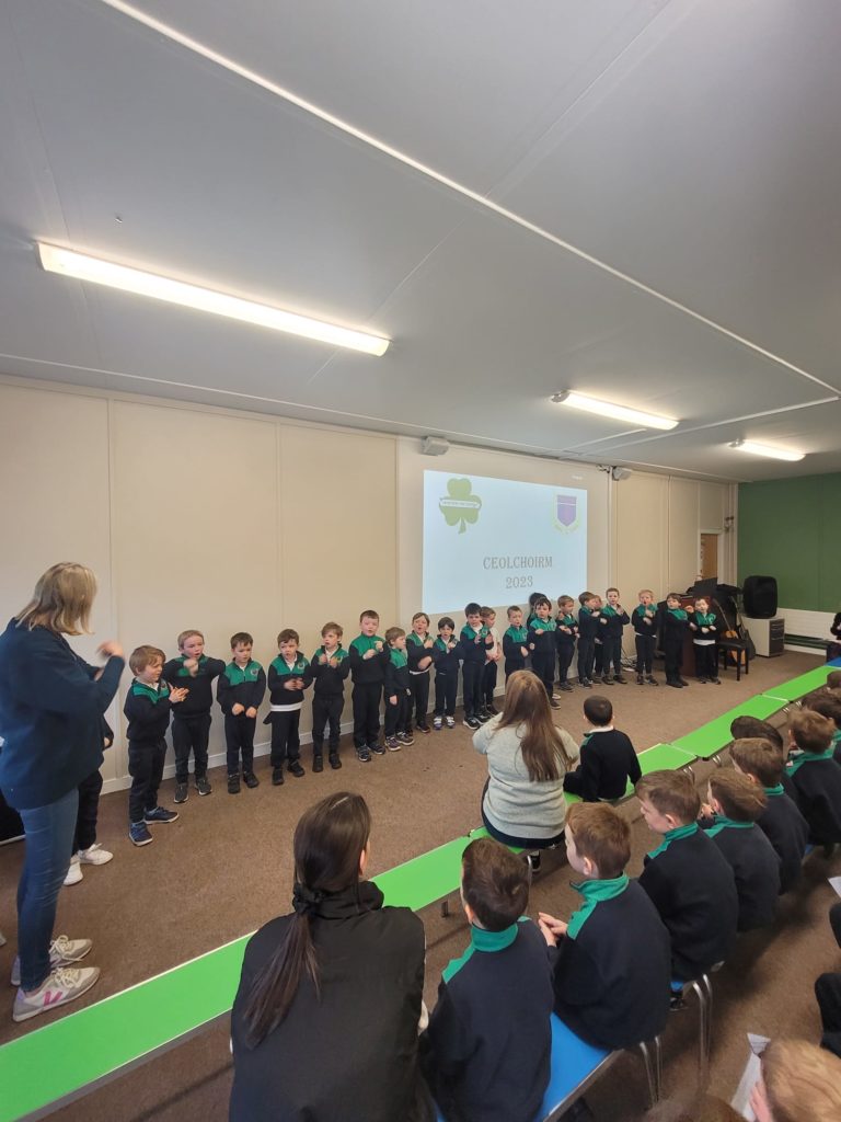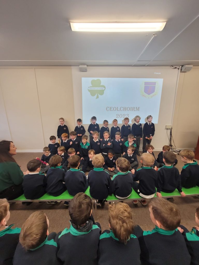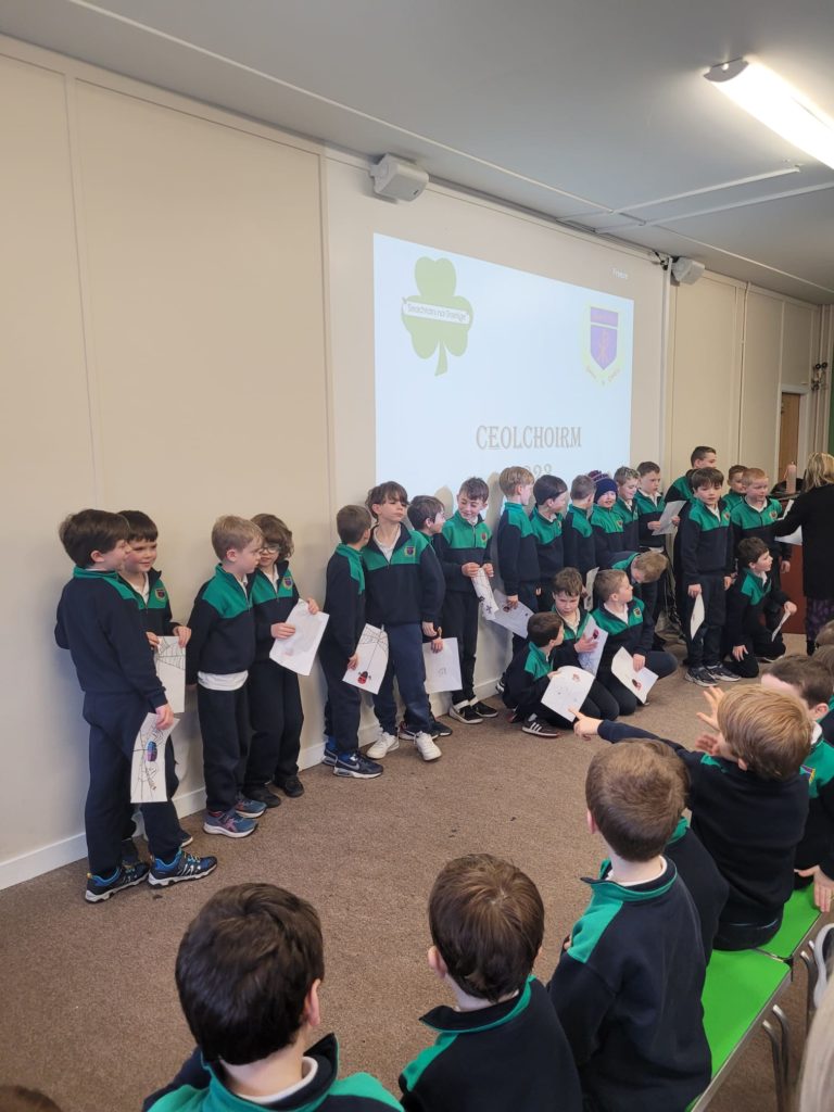 D’ullmhaigh na ranganna ar fad dán nó amhráin Gaeilge don cheolchoirm inniú. Ghlac naíonáin shóisearcha (Ms O’Kelly), naíonáin shóisearcha (Ms Gallagher), rang a haon (Ms Mooney), rang a dó (Ms Pléamonn), rang a trí (Ms O’Dell) agus rang a sé (Mr Smyth) páirt sa dara ceolchorim den lae. Bhí cúpla rang ann a d’ullmhaigh ealaín agus damhsa chun dul leis an taispeántais. Is léir go bhfuil neart tallainne ann i measc na buachaillí. Bhain na buachaillí agus na mhúinteoirí an-taitneamh as éisteacht leis an gceol agus na dánta ar fad. Bhí na pásití agus múinteoirí ar fad ag canadh leis an t-amhráin ‘Féar Glas Glas’ a d’ullmhaigh rang a trí don ocáid. Féach ar na griangraph iontach.