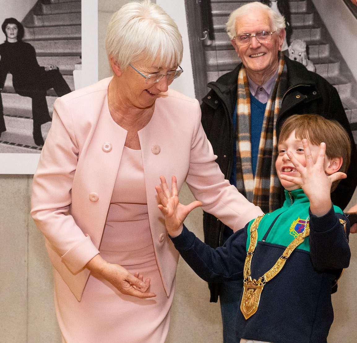 Donagh in Ms. Mooney’s 1st class was at the launch of his Grandad’s photographic exhibition at the LexIcon in Dun Laoghaire last Wednesday, 8th March. Former Minister of Education and current Mayor of Dun Laoghaoire – Rathdown Mary Hannifin launched the Exhibition and you’ll see Donagh wearing her chain of office…. over his Pius X tracksuit.