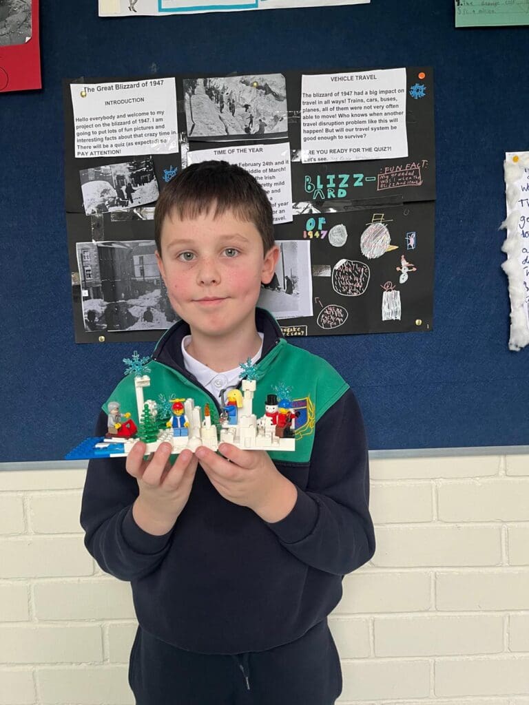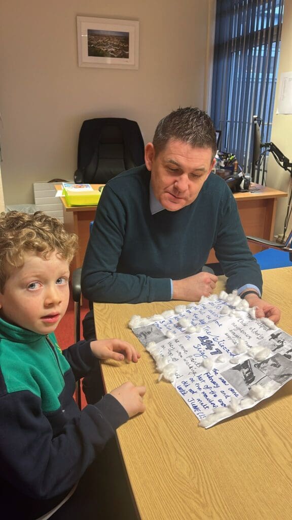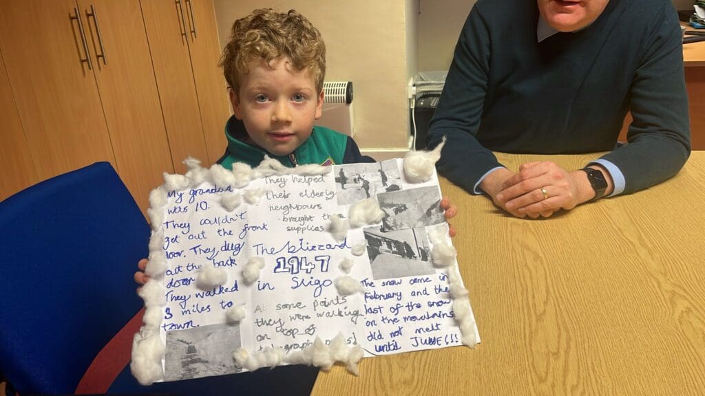 The boys in Ms. Pleamonn’s class worked really hard recently on their first piece of project work. The chosen topic was storms and in particular the big storm of 1947. Very apt given our recent weather. Mr. Coyle was particularly impressed with the 2nd class work. Peadar brought his project up to Mr. Coyle’s office to show him his excellent project. Peadar brought a letter into school his grandad sent. In the letter he describes the events of the blizzard of 1947 as he experienced them as a young 10 year old boy in Sligo.