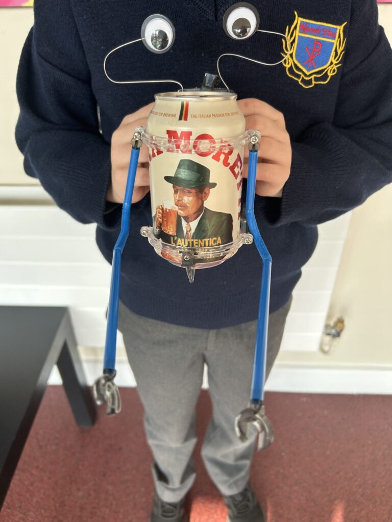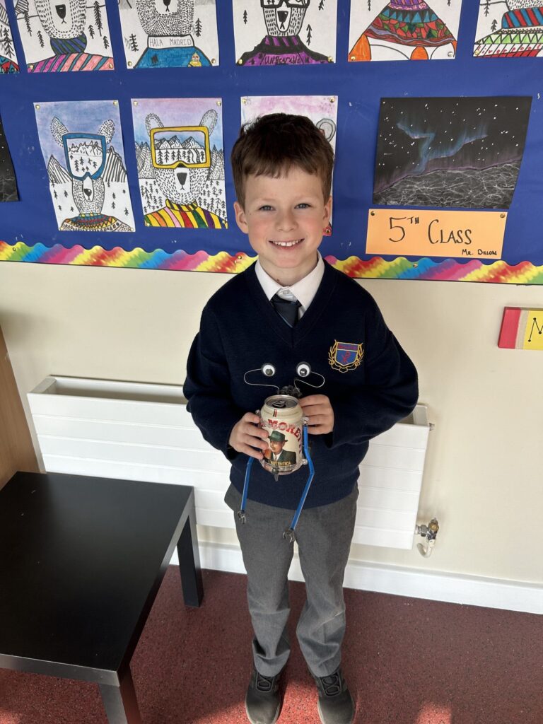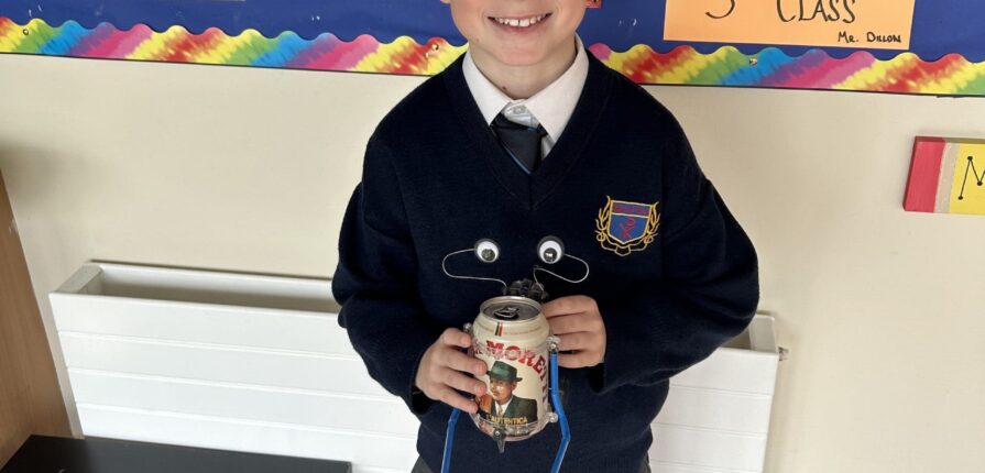 Finn in Ms. Carroll’s class brought in his cool invention that he made last week. Last week was Engineering Week in Ireland and Finn thought it would be a good time to make something using a tech kit he got for his birthday. Using some household items Finn made a Robot that moves forward, like a frog.