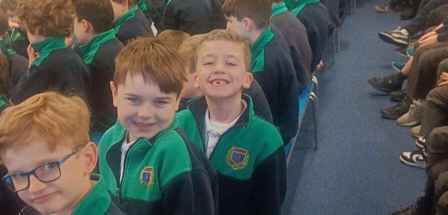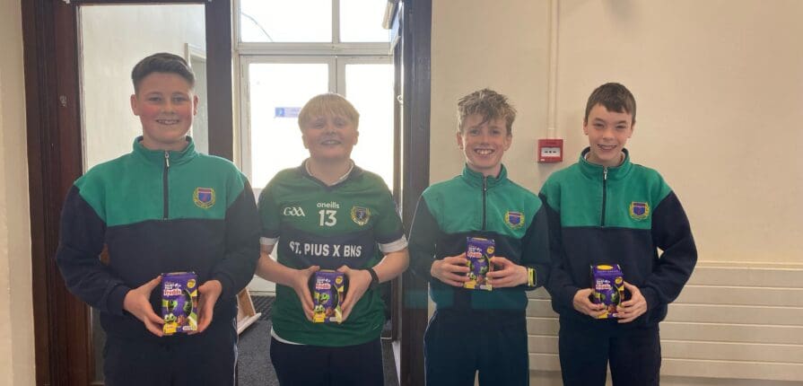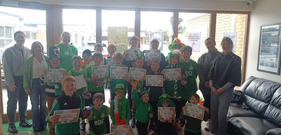 Bhí na buachaillí i rang a cúig agus rang a sé ag glacadh páirt i gcomórtas peile gaelach i dTír an Iúir ar maidin. Bhí sé fhoireann againn: Corcaigh, Ciarraí, Maigh Eo, Gaillimh, Dún na nGall, agus Tír Eoghain. D’imir gach buachaill go hiontach agus bhain siad an-taitneamh as an lá. Rinne gach buachaill sár-iarracht a gcuid ‘cúpla focal’ a