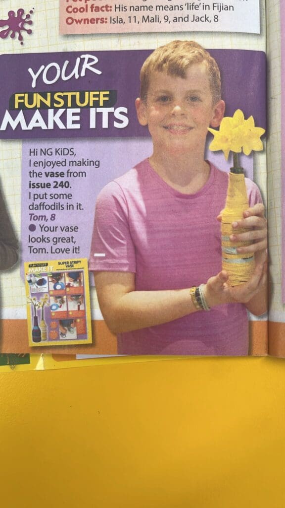 Tom in Ms. Pleamonn’s made a vase from an article in national geographic art lesson in the magazine. The vase was that good that the picture got published in this months issue. Well done Tom.