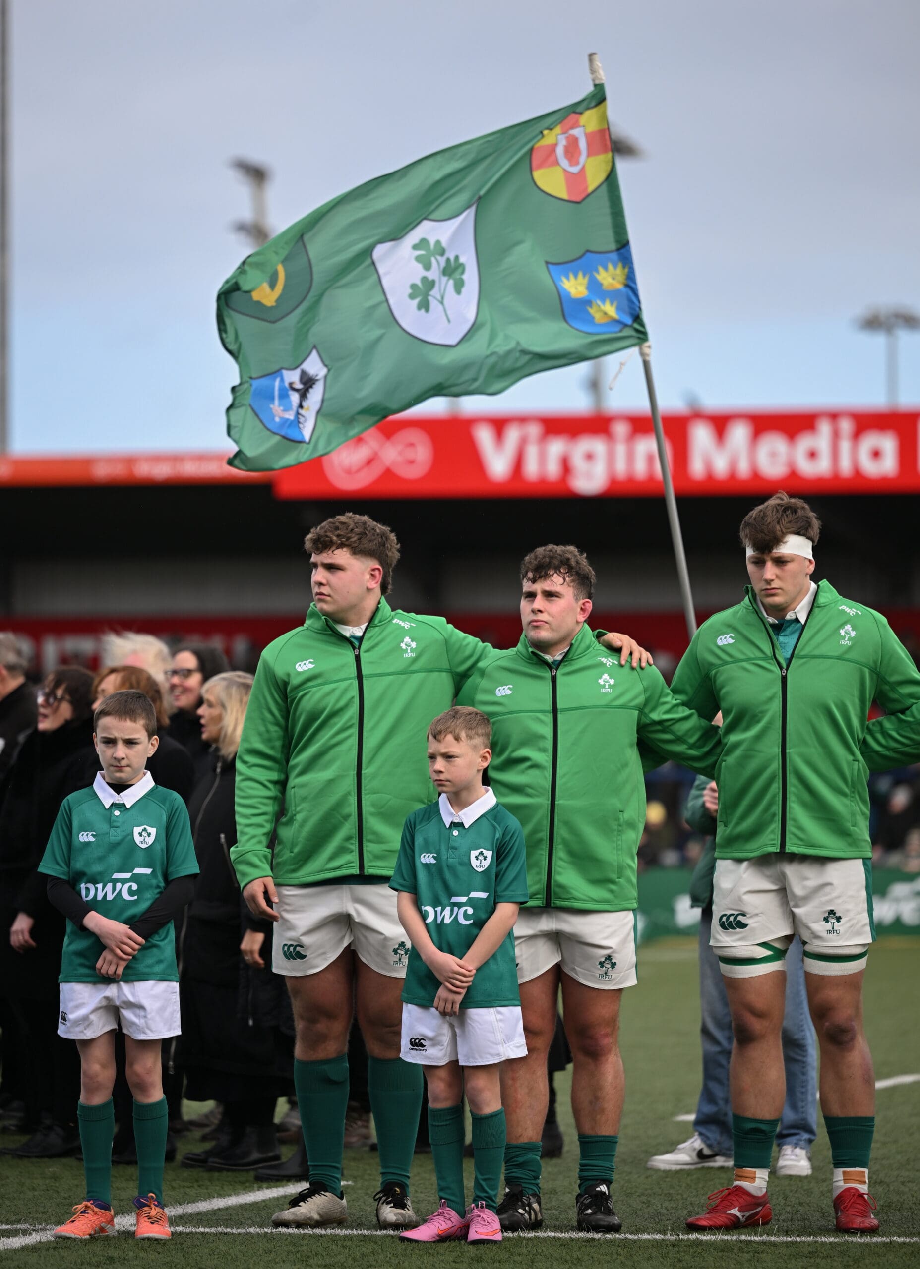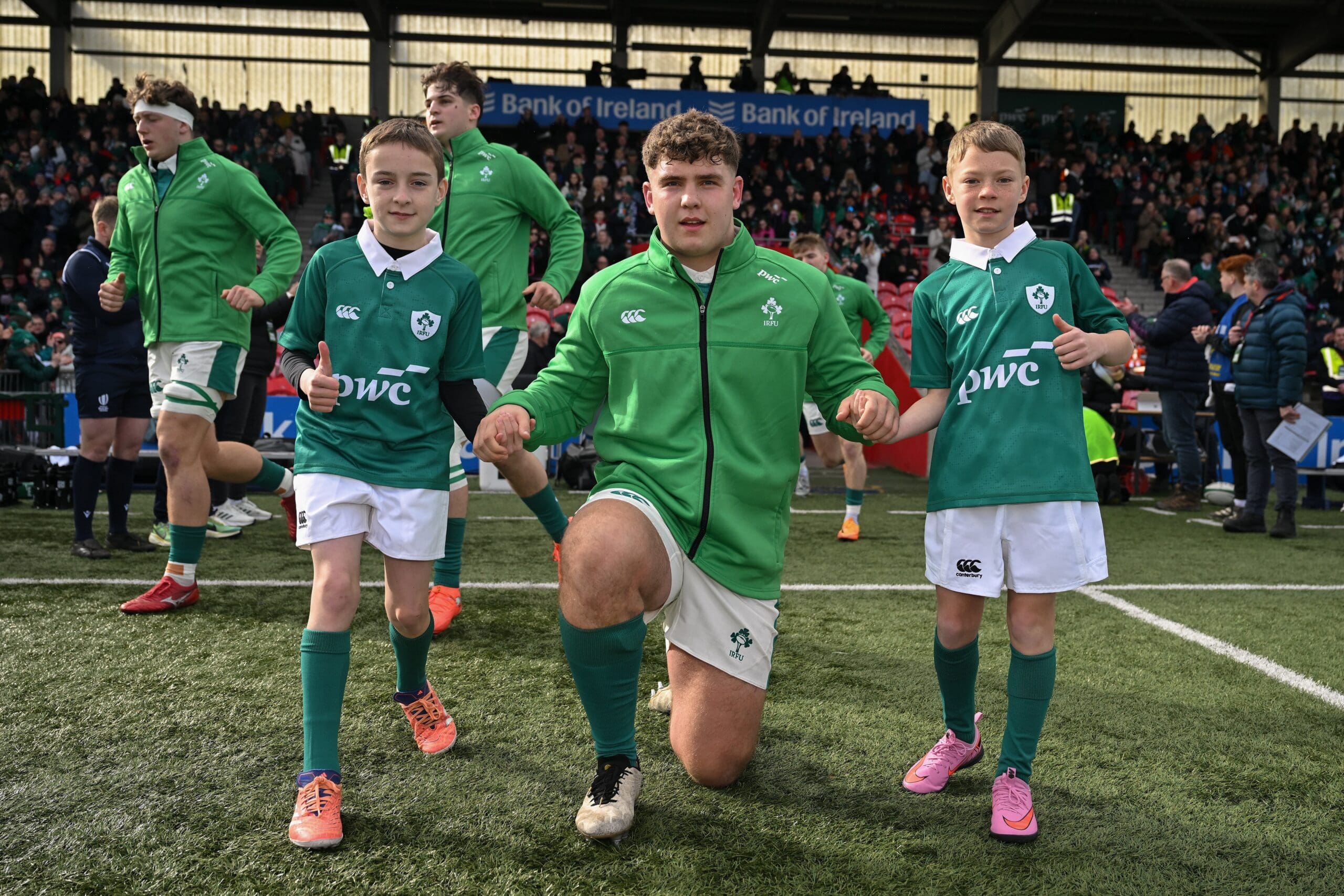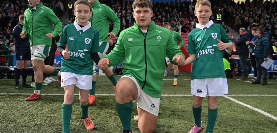 - 15 March 2026; Team mascots Rian Dever, left, and Jonah O’Sullivan with the team before the U20 Six Nations Rugby Championship match between Ireland and Scotland at Virgin Media Park in Cork. Photo by Brendan Moran/Sportsfile