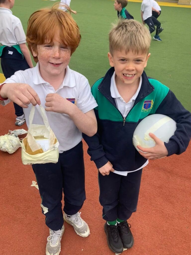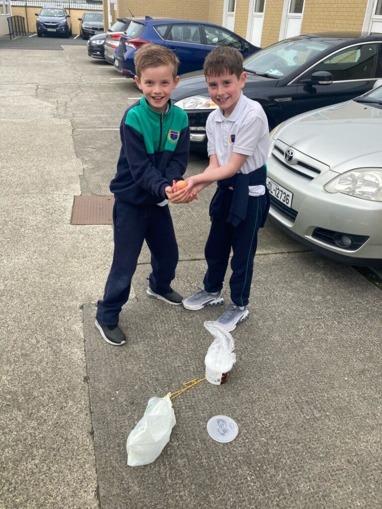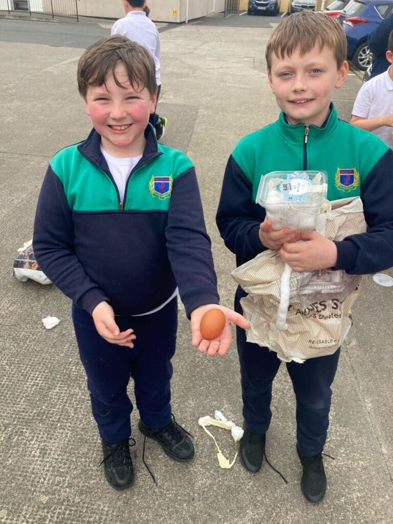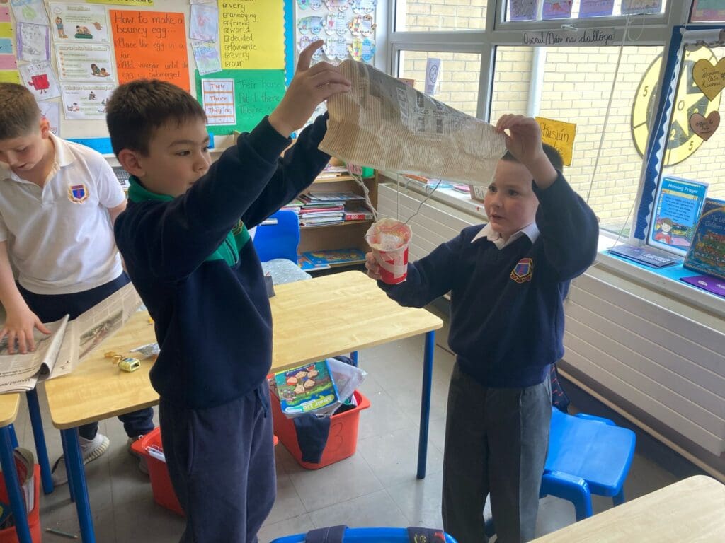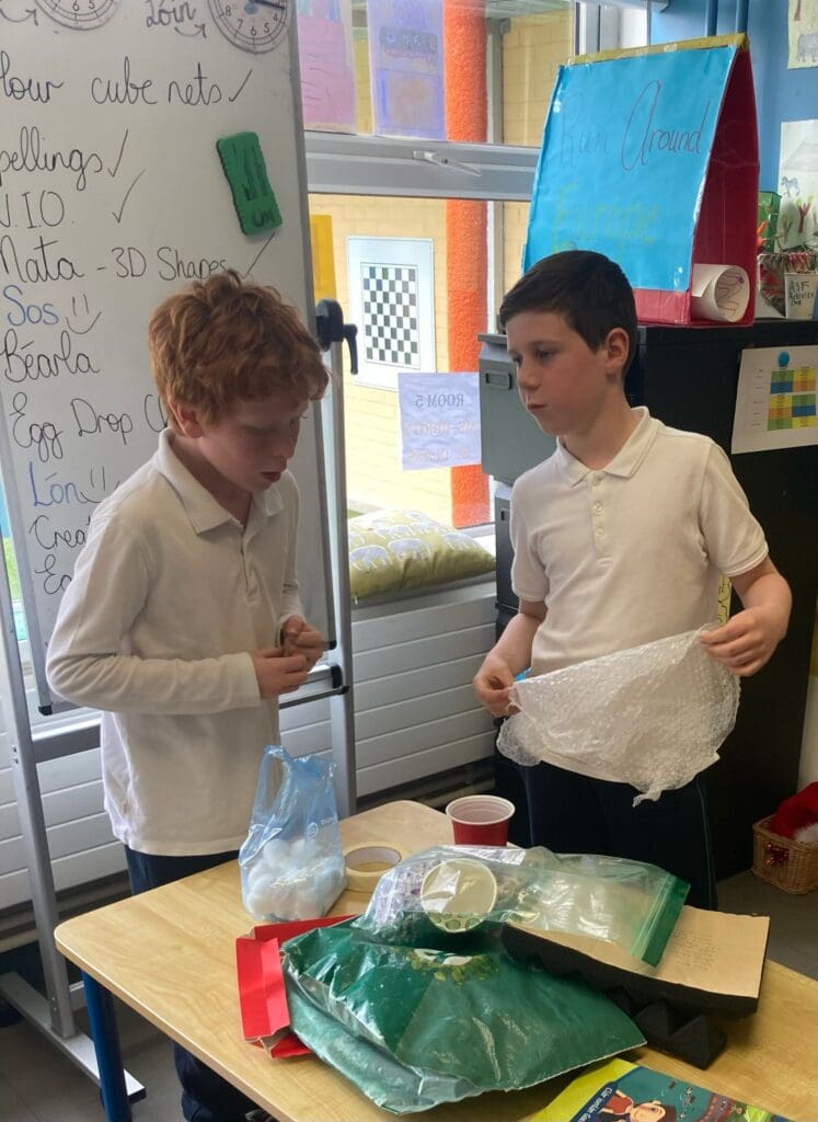 The boys in Ms. Herity’s class recently took part in an ‘Egg-drop Challenge’. Their objective was to design and make a container that would protect an egg from breaking when dropped from a height. Thanks to Mr. Deary for going up on the roof and doing the honours of dropping each project. Not all the eggs survived the drop, but lots of fun was had in the process!